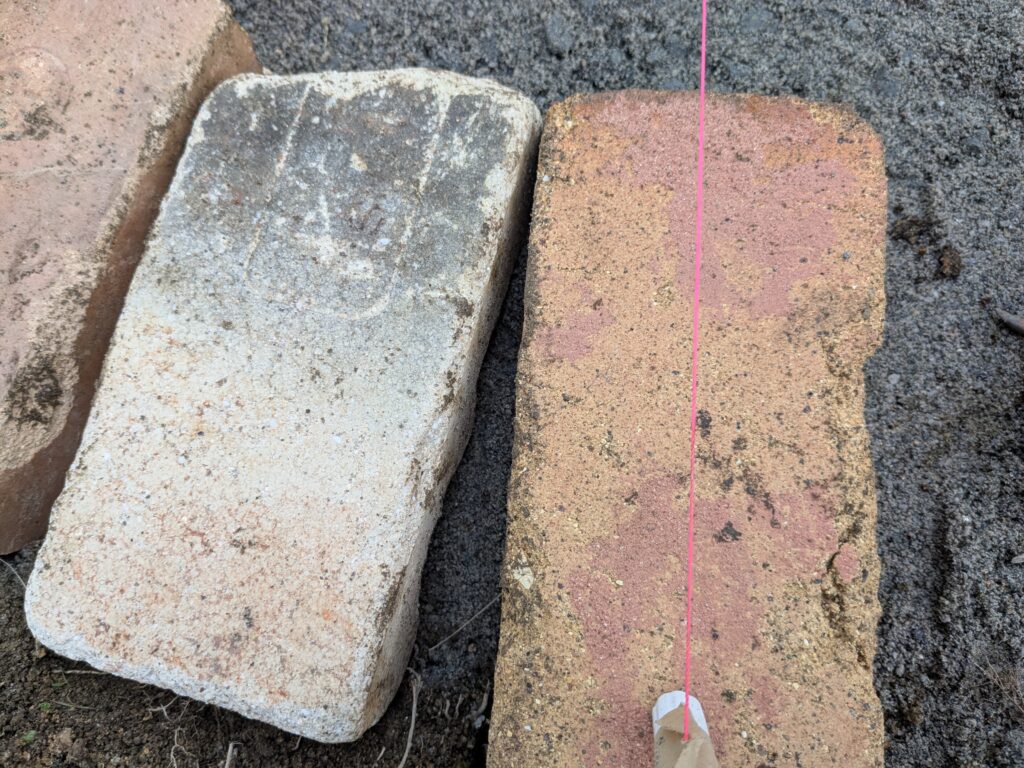 ピント張った紐がレンガの中心を通るようにしながらレンガを1個ずつ並べていきます