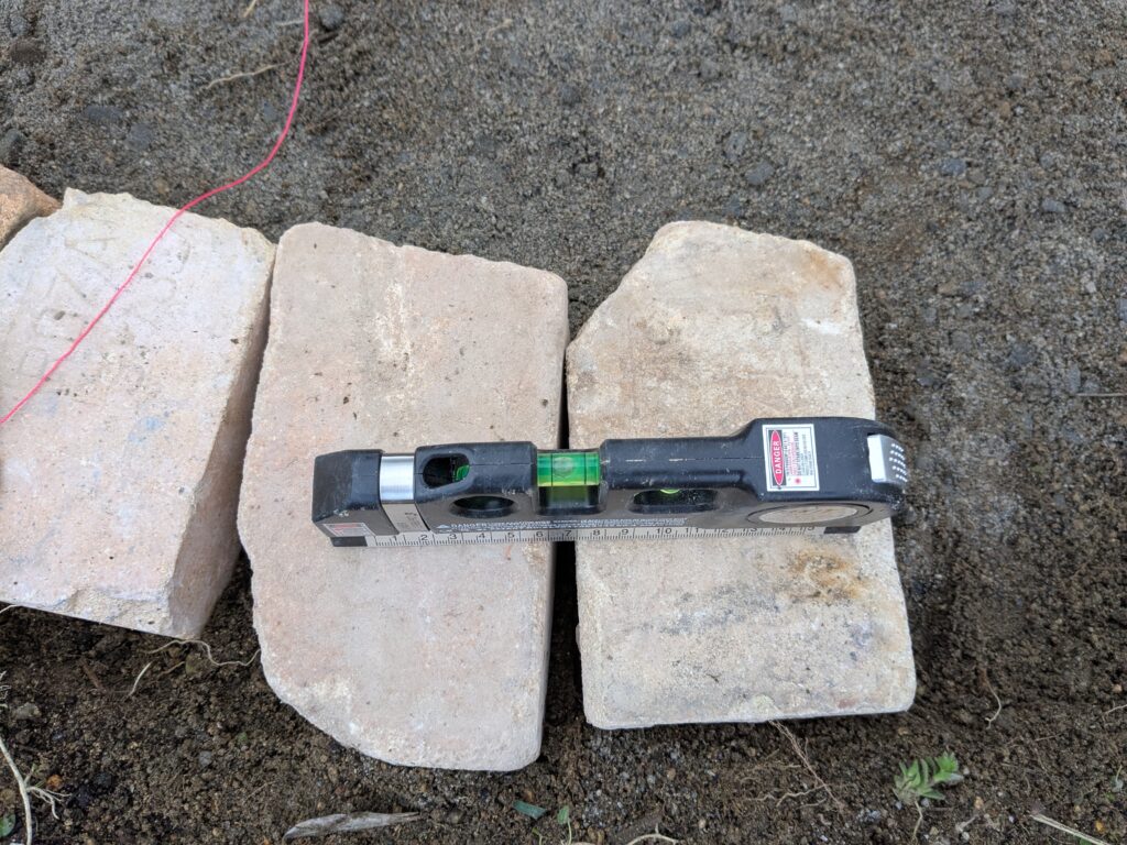 レンガを並べながら水平になっているか確かめ、もし傾いていればレンガの下の砂を調整して水平にしていきます